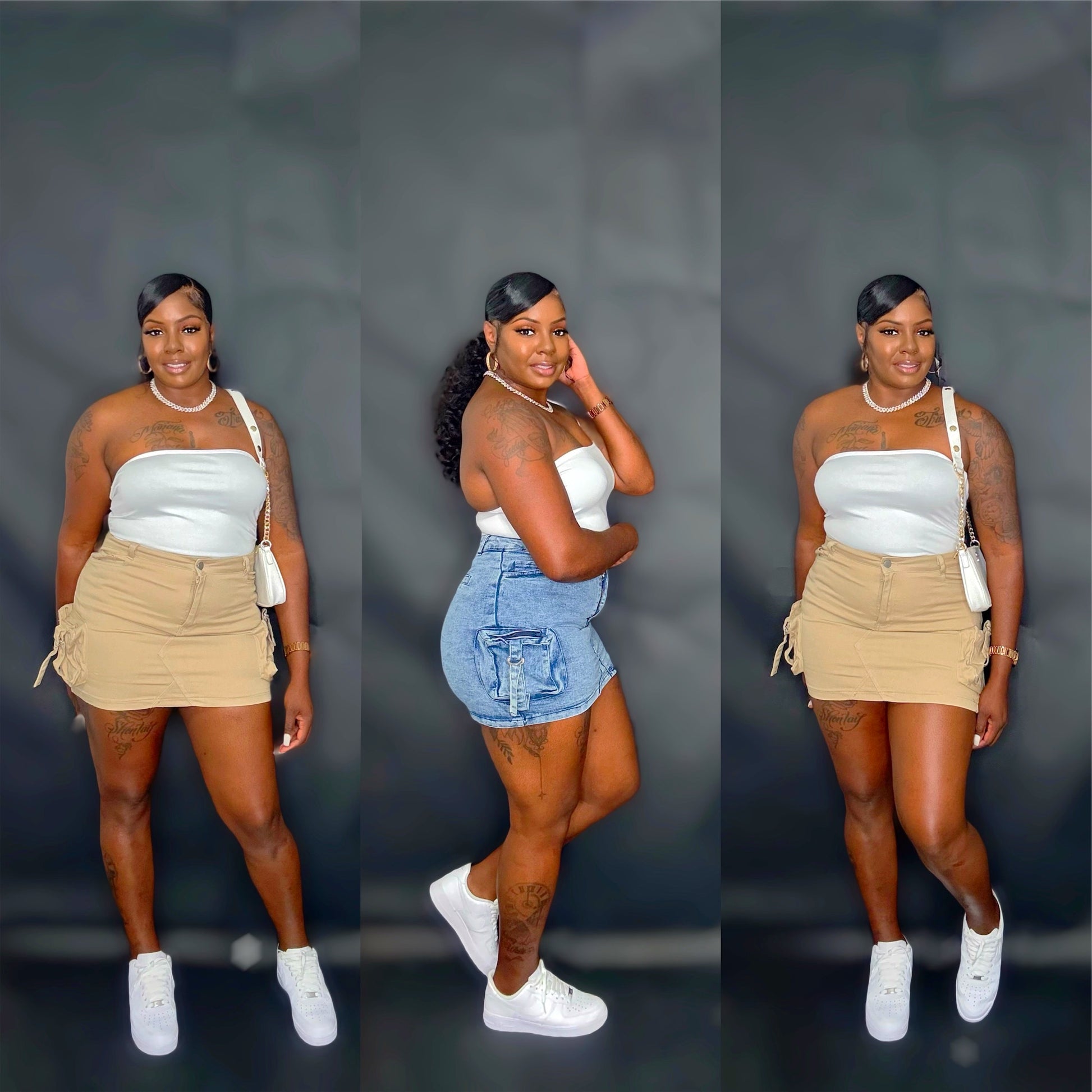 - High rise cargo mini denim skirt